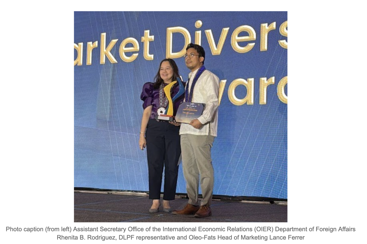 Photo caption (from left) Assistant Secretary Office of the International Economic Relations (OIER) Department of Foreign Affairs Rhenita B. Rodriguez, DLPF representative and Oleo-Fats Head of Marketing Lance Ferrer